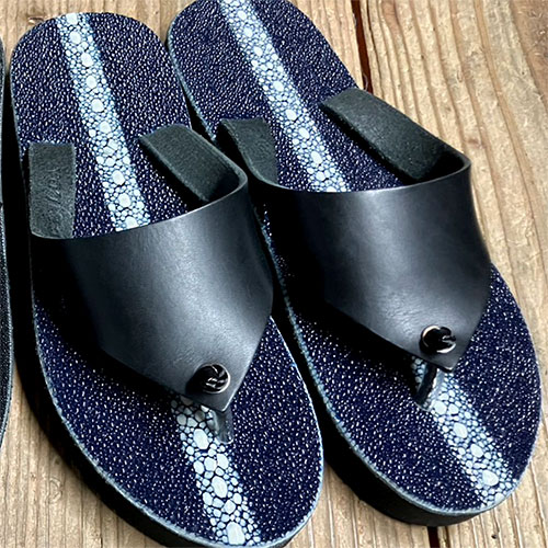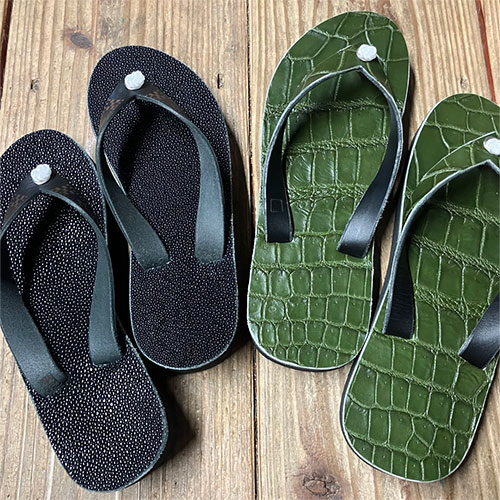 革人オリジナルの「革ぞうり」は、沖縄で以前から親しまれている「島ぞうり(本土ではビーチサンダルと呼ばれるのが一般的)」に牛革等を貼り付けたものです。 非常に軽く、履き心地がいいのが特徴です。 ソールのゴム部分と一部のパーツ以外は全て牛革で出来ており、ひとつひとつ丁寧に手作業で作っています。一足¥9,900~です。 革の種類は牛革(もとぶ牛)の他に、ヘビ革・トカゲ革・エイ革・クロコダイル革などがございます。 |