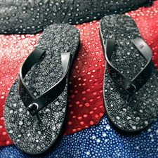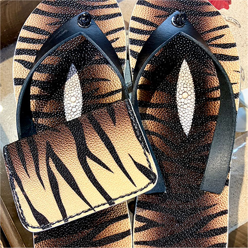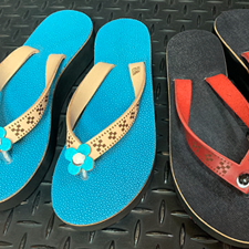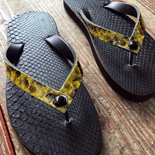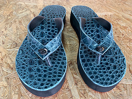 革人オリジナルの「革ぞうり」は、沖縄で以前から親しまれている「島ぞうり(本土ではビーチサンダルと呼ばれるのが一般的)」に牛革等を貼り付けたものです。 非常に軽く、履き心地がいいのが特徴です。 ソールのゴム部分と一部のパーツ以外は全て牛革で出来ており、ひとつひとつ丁寧に手作業で作っています。一足¥9,900~です。 革の種類は牛革(もとぶ牛)の他に、ヘビ革・トカゲ革・エイ革・クロコダイル革などがございます。 |